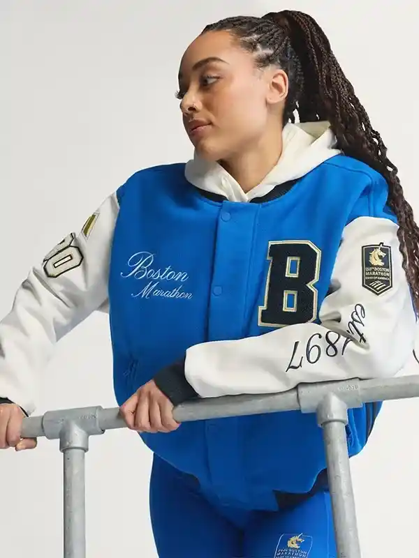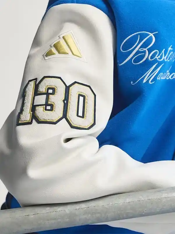 The blend of heavy-duty wool and supple leather, sleeves provides a structured drape that feels as premium as it looks. The vibrant blue and white tones are meticulously chosen to represent the marathon’s legacy, while the rib-knitted, details ensure the jacket retains its classic bomber shape. Whether you are a marathon enthusiast or a collector of varsity aesthetics, this piece provides a versatile foundation for any seasonal wardrobe.