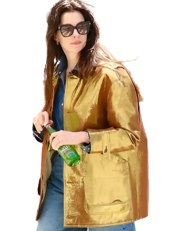 If you have been keeping up with celebrity fashion, you already know that Anne Hathaway is the queen of street style right now. Her latest look in New York City features a stunning gold metallic barn jacket that has everyone talking. It is the perfect mix of a classic “country” work coat and high-fashion glam. At TV Jackets, we have created a high-quality version of this viral coat so you can get that A-list look without the designer price tag.