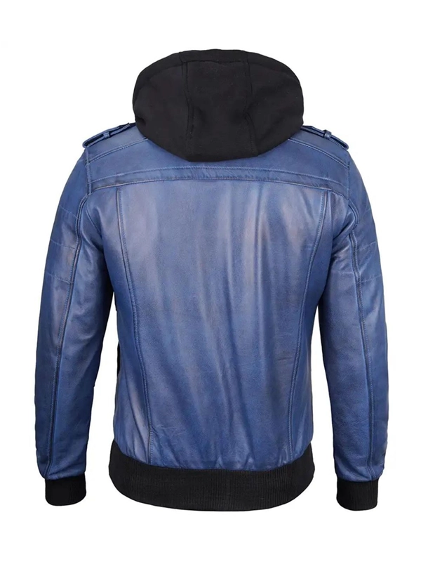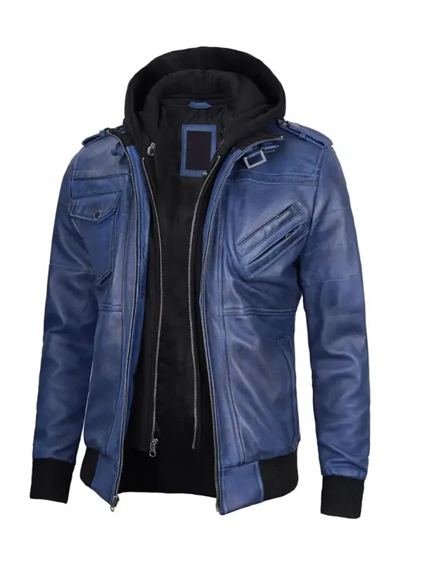 Blue Leather Jacket with Removable Hoodie For Men And Women