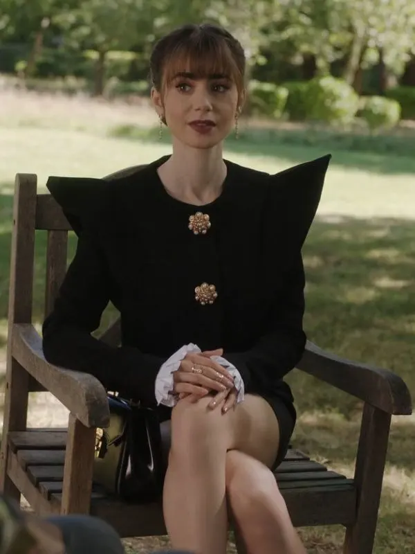 Emily Cooper Emily in Paris Season 3 Lily Collins Black Pointed Shoulders Top
