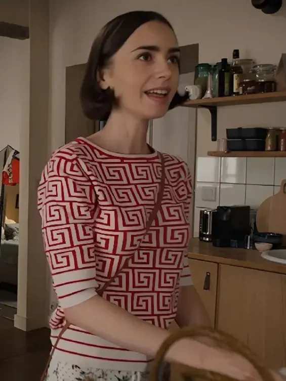 Emily Cooper Emily in Paris Season 5 Lily Collins Geometric Print Mid Sleeves Top – Red/White