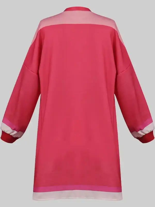 - The fashion buyer – attracted by the two-tone pink, the open-front silhouette, and the red rib-knit cuffs as a standalone fashion piece regardless of the film reference