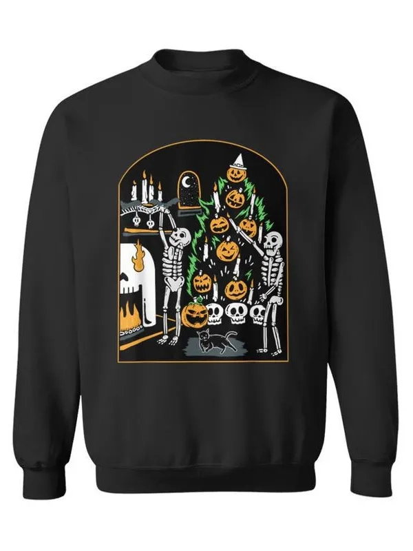 Halloween Skeleton Christmas Tree Pumpkin Spooky Black Printed Sweatshirt