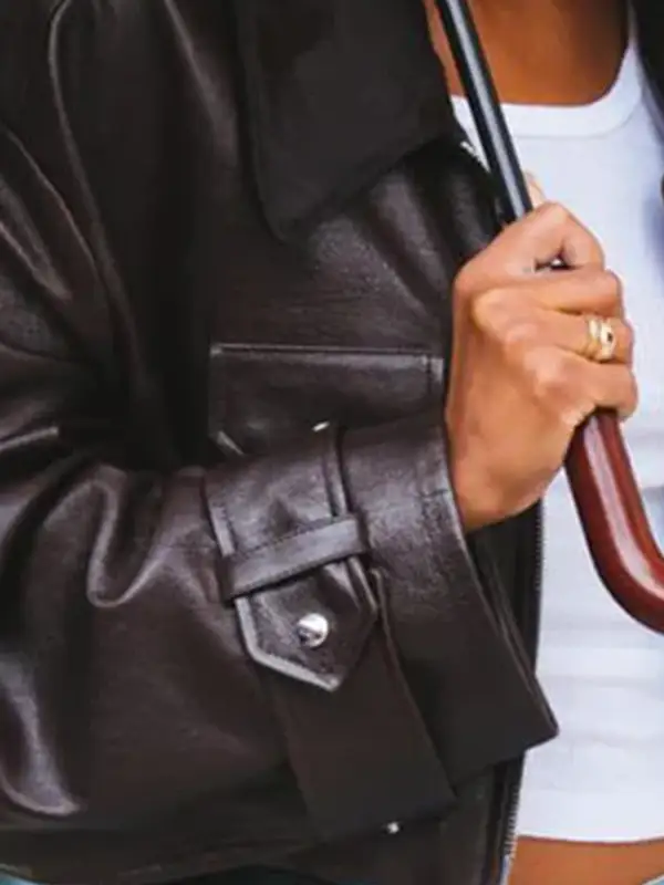 Laura Harrier Leather Jacket with Functional Detail and Everyday Utility