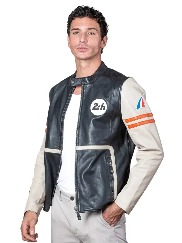 Mans Karl 24H Le Ecru Black Leather Jacket