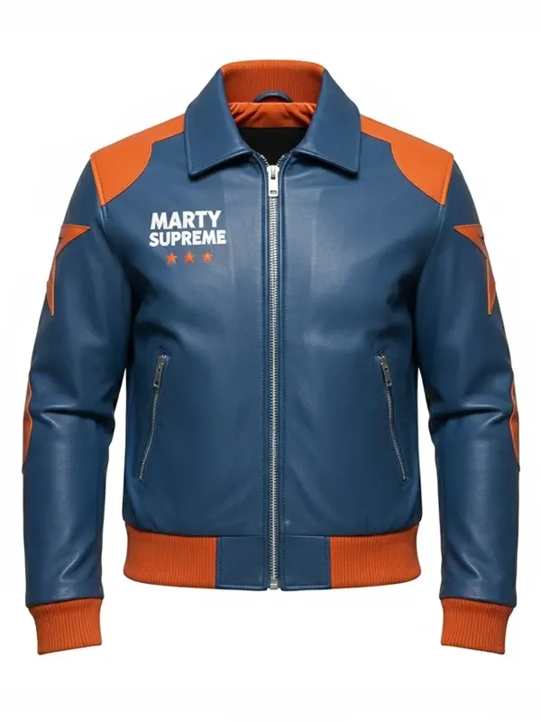The Marty Supreme Classic Bomber Jacket is a bold choice for men who want a colorful leather bomber with cinematic energy. Its real leather construction, orange and blue colorway, front zipper closure, and comfortable inner lining make it both stylish and practical.