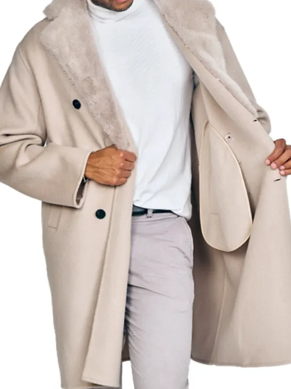 Beige Wool Trench Coat for Men With Shearling Collar Winter Style