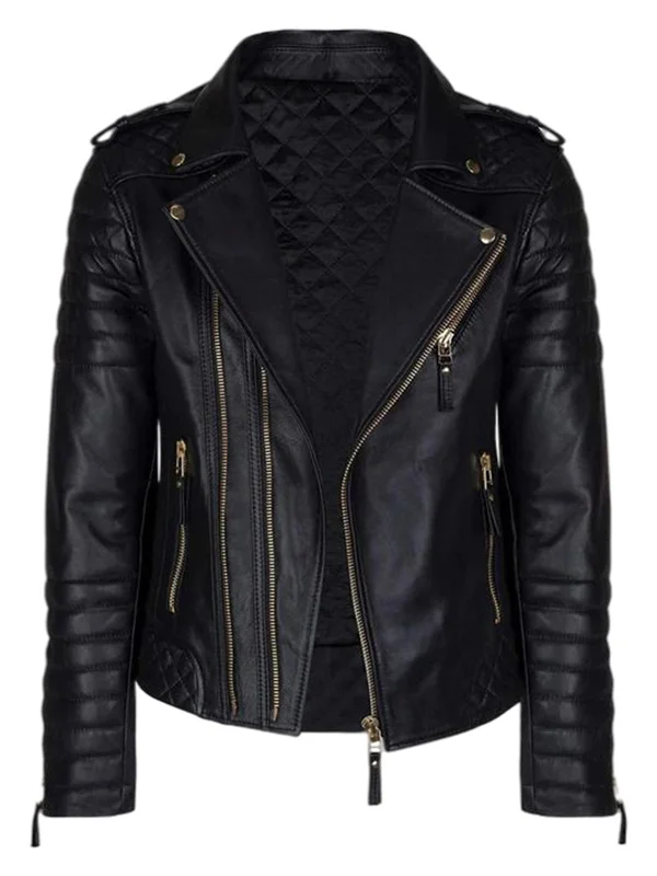 Black Leather Biker Jacket For Men With Gold Zippers