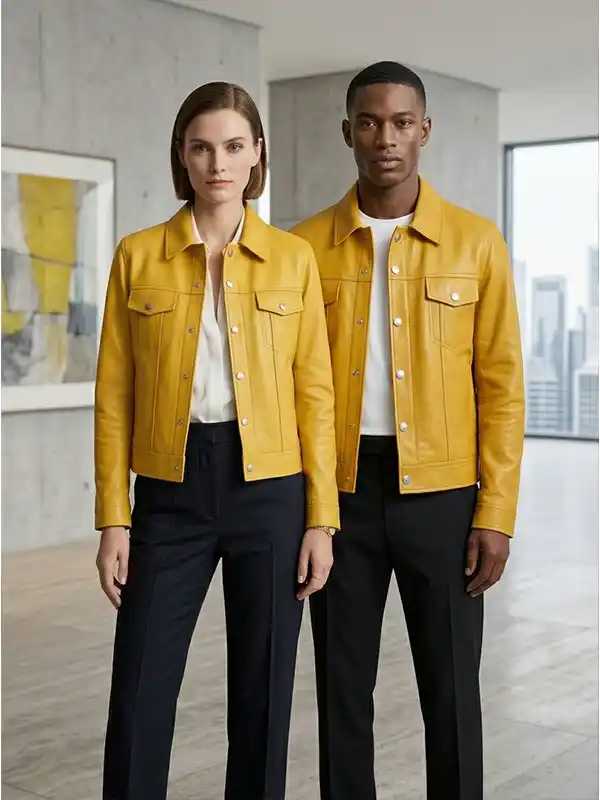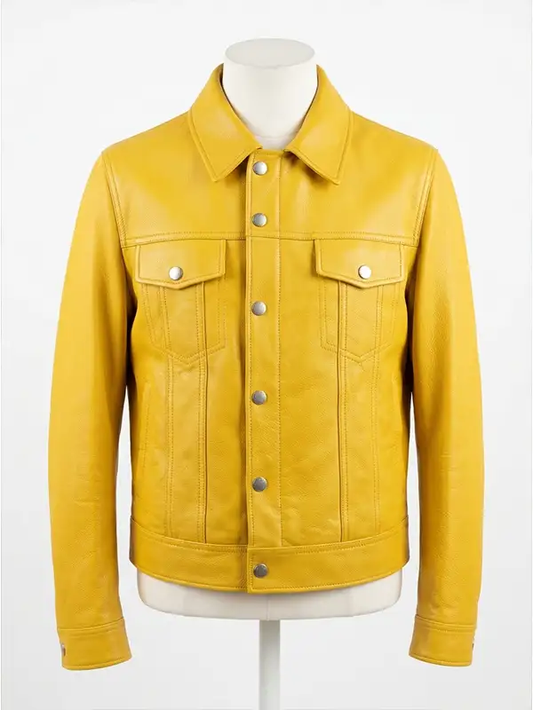 The Mens Yellow Leather Jacket is made for shoppers who want a bold color with a clean everyday shape. Instead of a heavy moto look, this design follows a neat trucker-inspired structure with a shirt style collar, front button closure, and two outside chest pockets. It gives you the statement feel of a yellow leather jacket while keeping the overall style easy to wear with daily outfits.