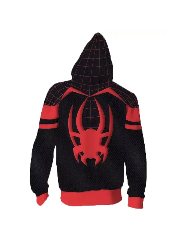 When Spider-Man: Miles Morales launched in November 2020, one of the first things players noticed was the suit. Miles did not inherit Peter Parker’s red and blue. He built his own. The black and red Spider-Man suit, with its glowing web lines and oversized spider emblem, became one of the most distinctive superhero designs in gaming history. It was a visual statement about identity, about a new kind of hero, and about a teenager claiming his own version of the Spider-Man legacy rather than copying the one before him. This hoodie brings that suit design into a wearable, everyday premium cotton build, made to order and available now from TVJackets.com.