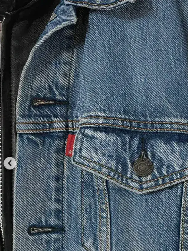 What makes this one different? It’s a hybrid. You’re getting that classic, heavy-duty blue denim vest body that looks like it’s seen a few basement D&D sessions, paired with sleek black leather sleeves. It gives you that “layered” look without having to actually wear two jackets. The denim has that perfect slightly-worn feel, and the leather adds just enough edge to make it a legit piece of streetwear you can wear any day—not just at a convention.