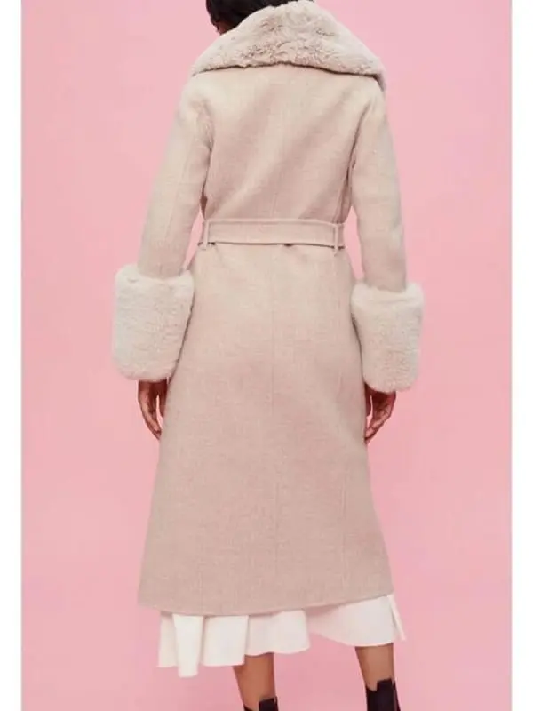 This fur trim coat is an ideal outerwear for cold winters. It is made from high quality wool and faux fur which ensures a great heat trapping. The soft internal lining makes it very comfortable to wear. The front is very elegant owing to the belted closure. Its style is further enhanced by the large fur collars which keep your neck warm. This beige colored coat has open hem fur cuffs like Laura Haddock Beige Coat.