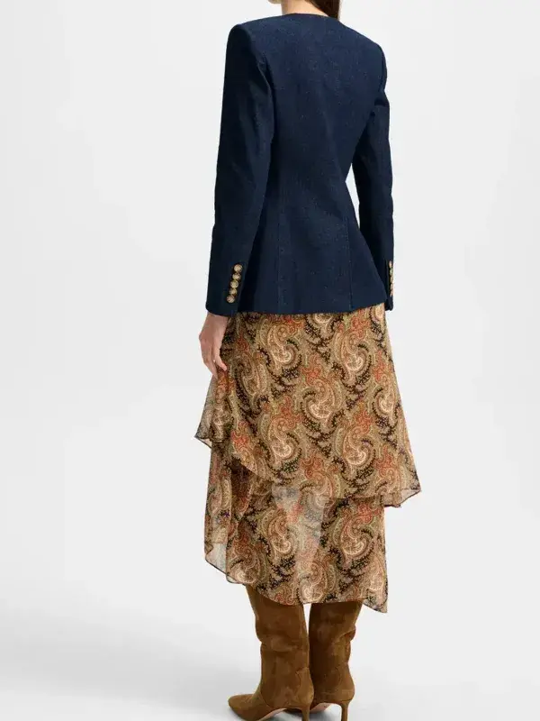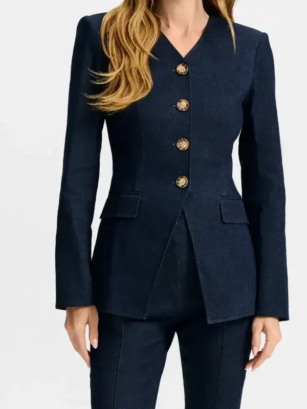 The Today Show 2026 Savannah Guthrie Collarless V-Neck, Amber Buttons Dark Indigo Denim Blazer