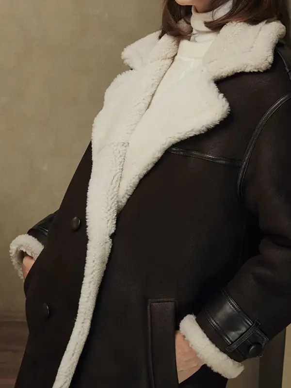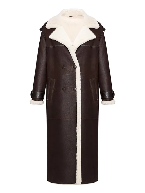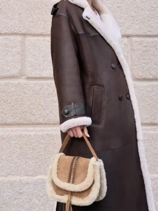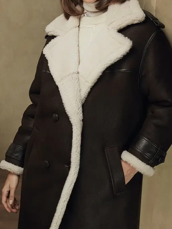 This long coat features a soft shearling interior, four-button front, and two large flap pockets that add both function and style. The inner zippered pockets help keep small items secure, while the sleeve belt details and shoulder accents give the coat a stronger modern finish. Its longline shape makes it a smart choice for colder days when you want better coverage without losing style.