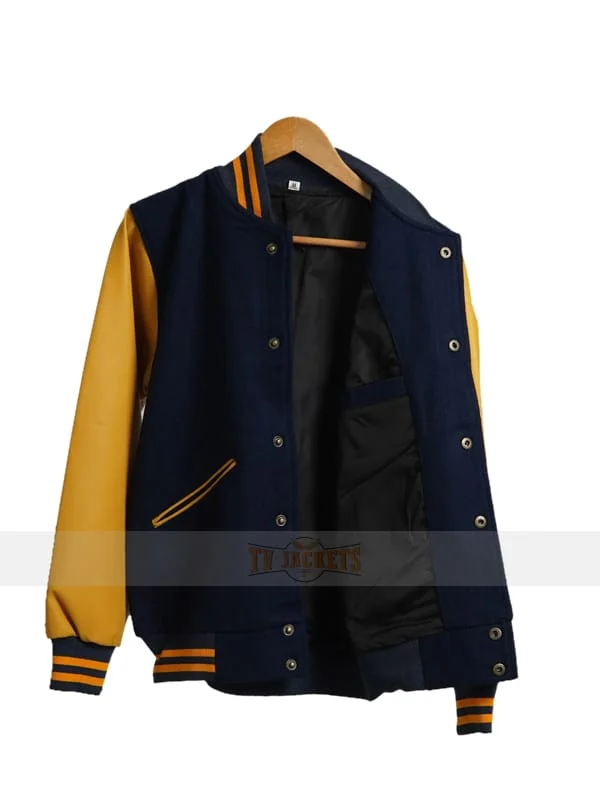 Get your hands on the striking Varsity Jacket Ella Purnell wore in the 2021 film. Ella Purnell Blue Varsity Jacket has sleeves made of leather and is made from premium fleece material. To offer a more lustrous look, a viscose fabric is used on the interior. If you’re going on a day trip or attending a sporting event, this is a great suit to choose because the blue and yellow combo is visually appealing.